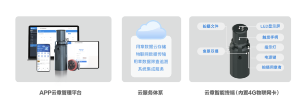 云章產品專為解決政企單位印章管理痛點的智能印章產品,是國內首創的智慧用章管理解決方案。它能夠兼容市面上90%實體印章整體嵌入,不破壞原有印章,即裝即用。云章體積小、重量輕、攜帶方便,尤其適合移動辦公;其內置4G物聯網卡,超大本地內存卡,搭載高清魚眼雙攝像頭,能夠自動拍照,記錄用章人和文件,將數據同步上傳至云端存儲。此外,還能夠融合對接企業OA、ERP等辦公系統,智能鎖定,實時定位,提供私有化部署。