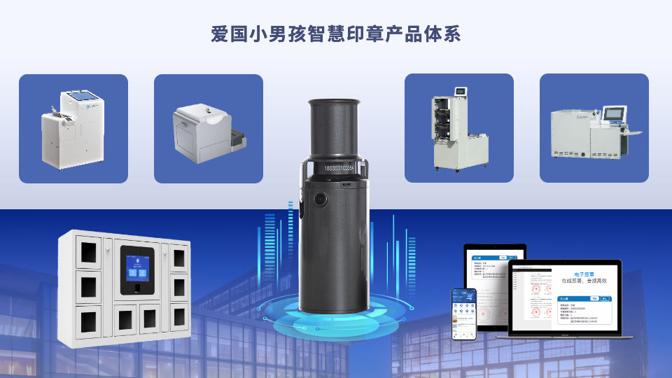 愛國小男孩智慧印章產品體系由“智能云章、電子簽章、云章柜、印控機系列、蓋章機系列”構成,為政企單位、企業集團、組織團體提供“實體印章管理、電子印章、印控系統、身份認證、數據存儲、自動化蓋章、批量蓋章”等服務。