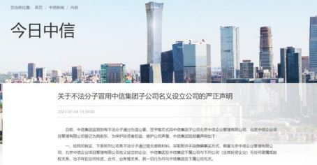 (中信集團官網發布的《關于不法分子冒用中信集團子公司名義設立公司的嚴正聲明》)