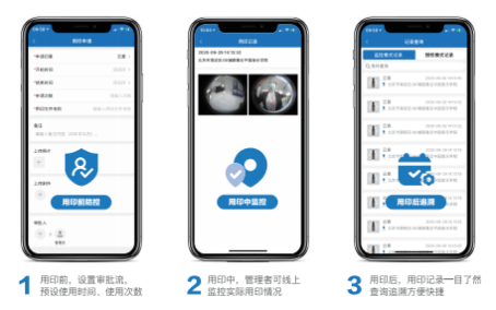 智能印章采用云平臺、客戶端(手機App和Web)及智能終端三位融合的交互方式,通過鏡頭記錄每一次蓋章的過程:使用人、對象、時間、地點,確保用印過程可防控、可監(jiān)管、可查詢、可追溯,防范用印風險,真正解放印章管理者工作壓力,降低風險。