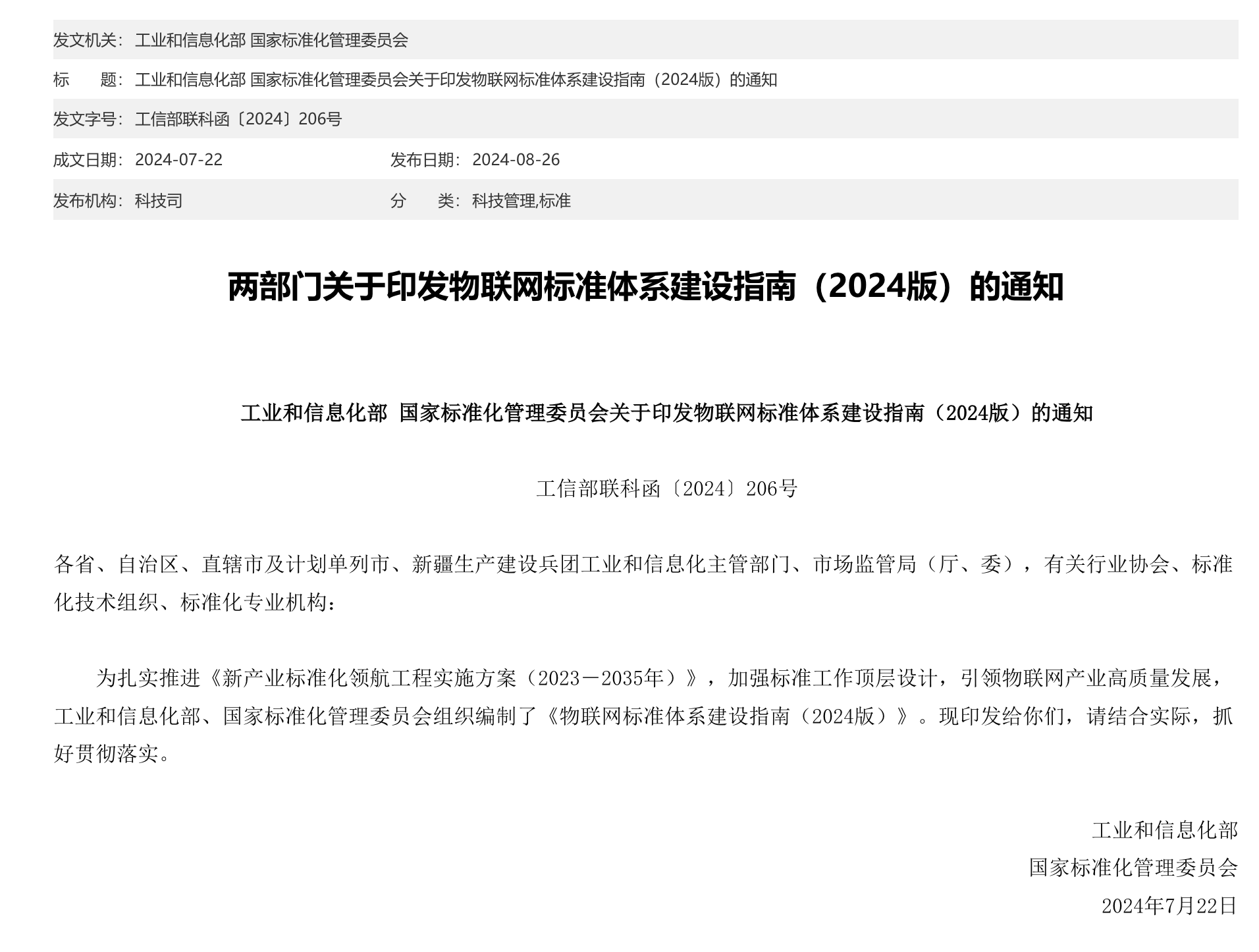 兩部門印發《物聯網標準體系建設指南(2024版)》