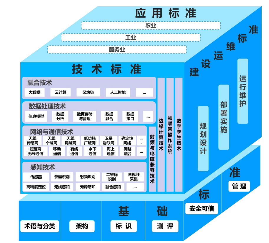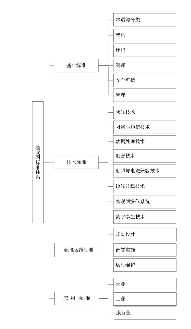 根據《指南》,物聯網標準體系包括基礎標準、技術標準、建設運維標準和應用標準等4個部分。其中,基礎標準包括術語與分類、架構、標識、測評、安全可信、管理等標準;技術標準包括感知技術、網絡與通信技術、數據處理技術、融合技術、射頻與電磁兼容技術、邊緣計算技術、物聯網操作系統、數字孿生技術等標準;建設運維標準包括規劃設計、部署實施、運行維護等標準;應用標準結合農業、工業、服務業等產業發展特點,提出面向各行業的物聯網應用指南。