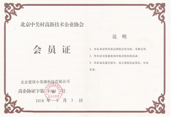 2018年8月3日,作為國家級高新技術企業,在北京中關村高新企業協會隆重邀請下,北京愛國小男孩科技有限公司應邀加入協會,成為其重要會員單位。