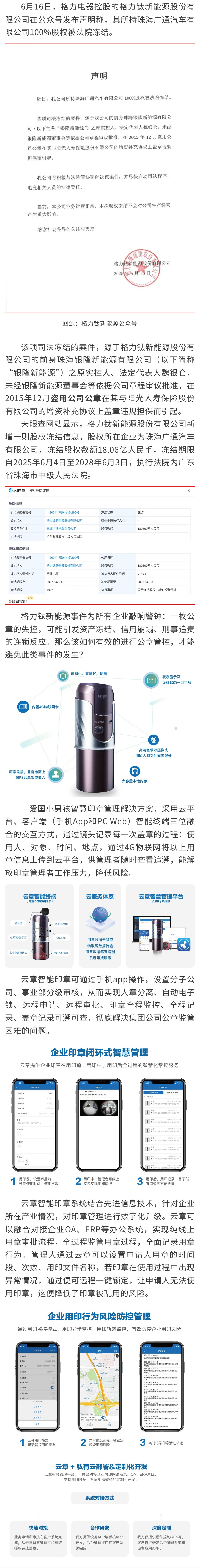 格力鈦新能源18億股權(quán)被凍結(jié) 牽出原實(shí)控人盜用公章舊案